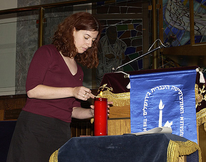 Feldman happened to run into Blutstein, her roommate's boyfriend, the night before he was killed. "Before we parted, he told me how excited he was to see his parents. He had a ticket for the next night. Unfortunately he flew home in a casket." Shari Goldberg lights a memorial candle for Hebrew U victims of terror.